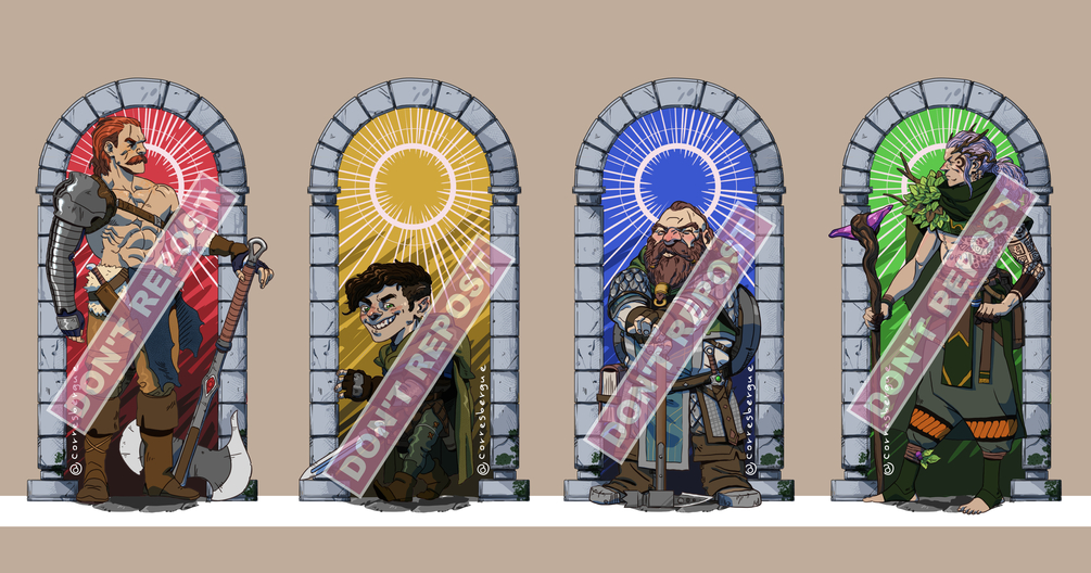 This is a pack of 4 adventurers for your DnD campaign, they include a human barbarian, a rogue halfling, a dwarf cleric and an elf druid. The tokens also include a color variation for each of the characters.